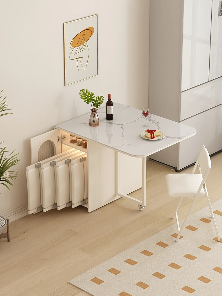 風の島の魅力を感じる!伸縮可能で多機能な岩盤一体型ダイニングテーブル - スタイリッシュなホワイト、収納キャビネット付きコンパクト折りたたみ式デザイン!