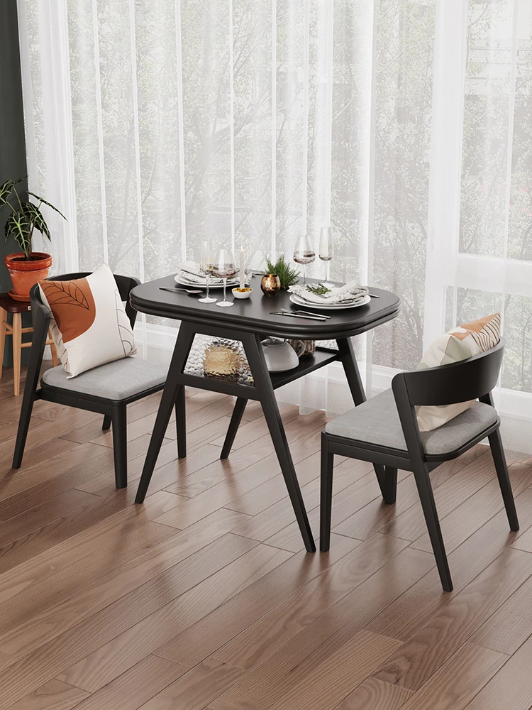 和風無垢材と岩板融合!省スペース小型ダイニングテーブル - 壁際にぴったり、折りたたみ式伸縮デザインで便利なサイドボード一体型