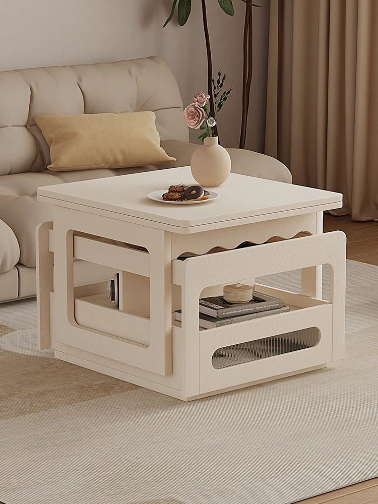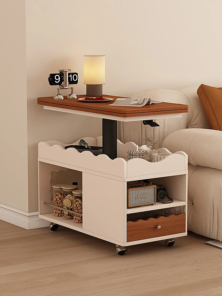 【魅力复古】多功能クリーム色ソファサイドテーブル&ミニカート - 小型住まいに最適!リビングやベッドルームにぴったりの昇降式可動ティーテーブル