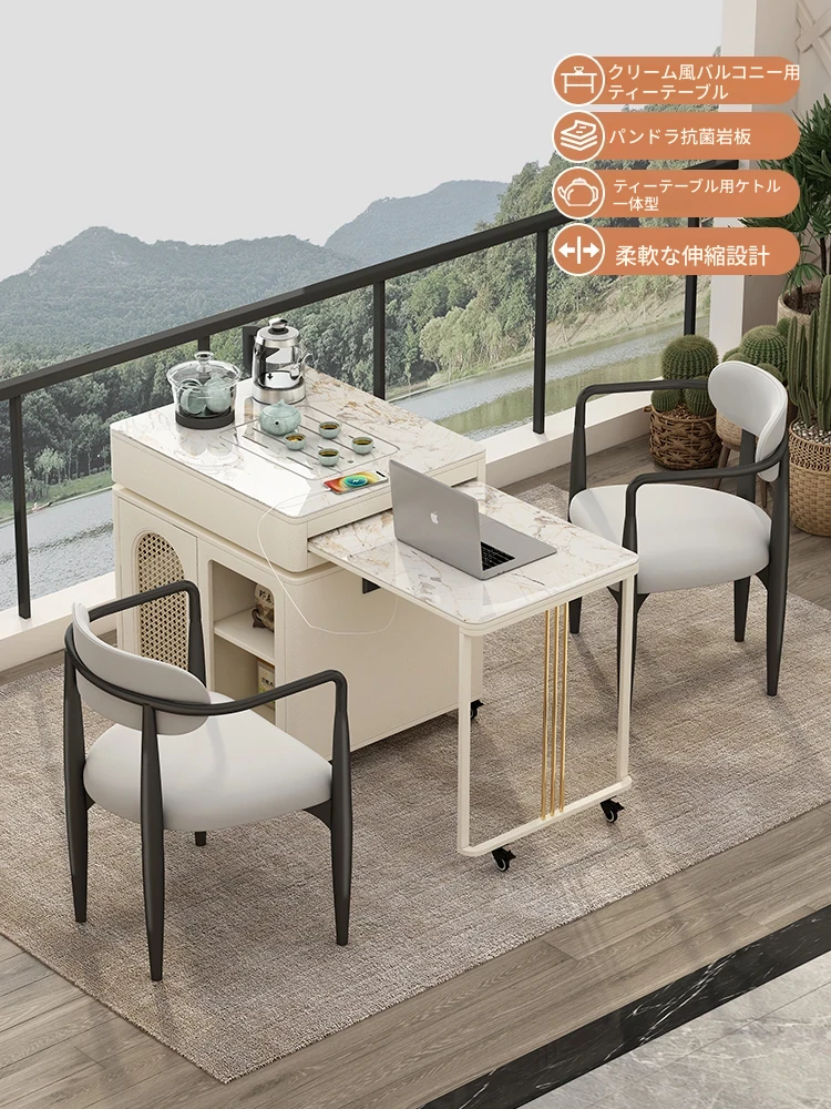 クリーム風バルコニーティーセット - リビングルームや家庭にぴったり!伸縮自在のティーテーブル、移動可能なティーワゴン、ケトル一体型で使い勝手抜群!リラックスタイムをおしゃれに演出♪