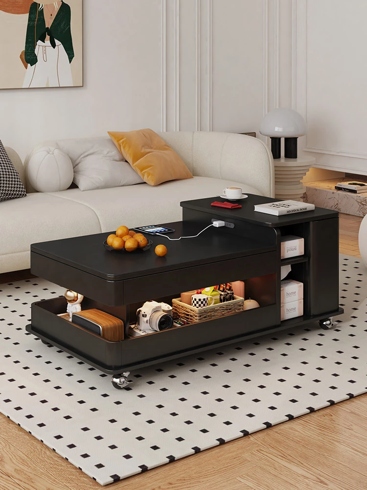 フレンチレトロスタイルの多機能コーヒーテーブル:モバイルサイドテーブル・やかん一体型・リビングルームでも使える昇降式ブラックキャスター付き!