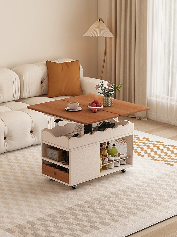 フレンチヴィンテージ風昇降式折りたたみテーブル:多機能ダイニング兼用で便利!リビングにぴったりな収納キャビネット、移動もラクラク