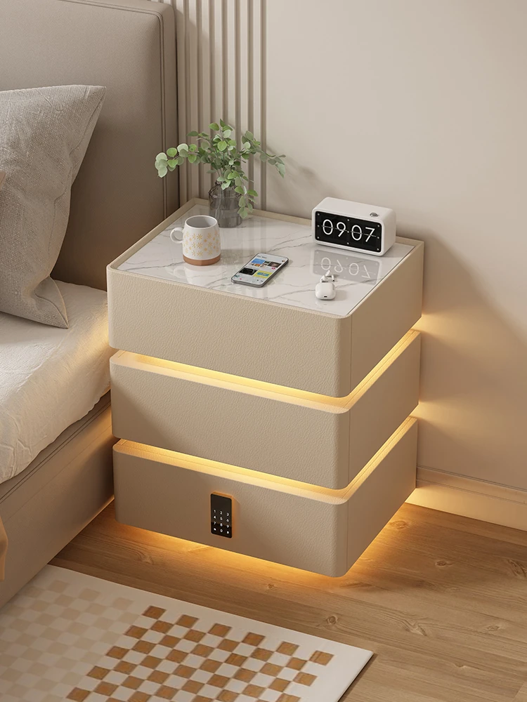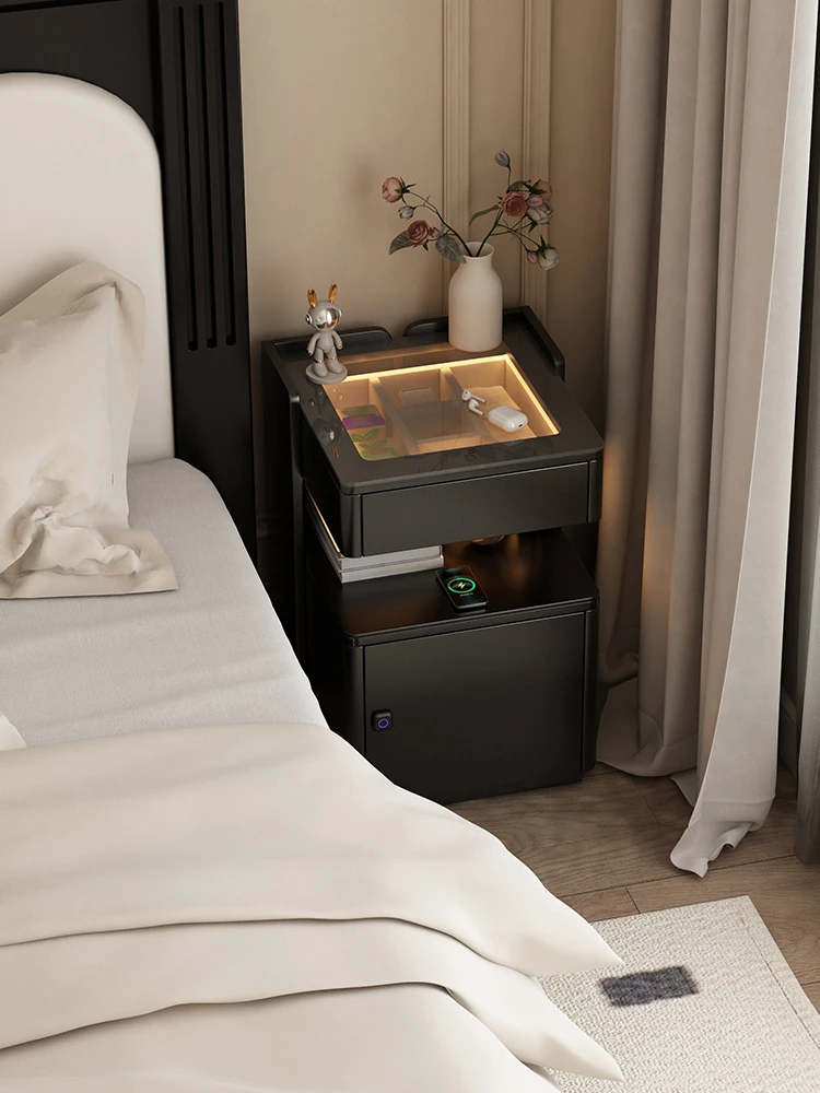 Sleek Black Italian-Style Minimalist Nightstand with Integrated Light and Lockable Drawer - Perfect for Compact Spaces