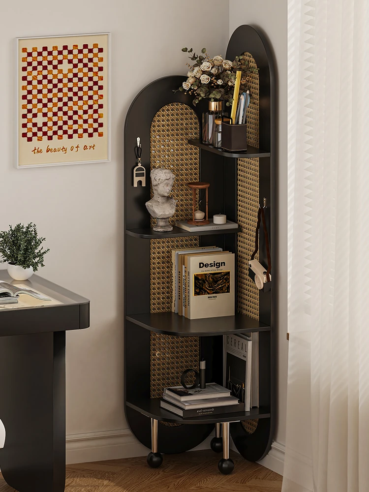French Vintage Rattan Corner Bookshelf - Space-Saving L-Shaped Display Cabinet for Cozy American-Style Home Office or Living Room