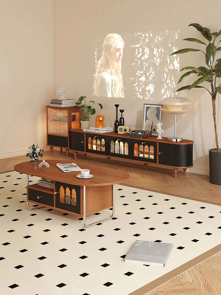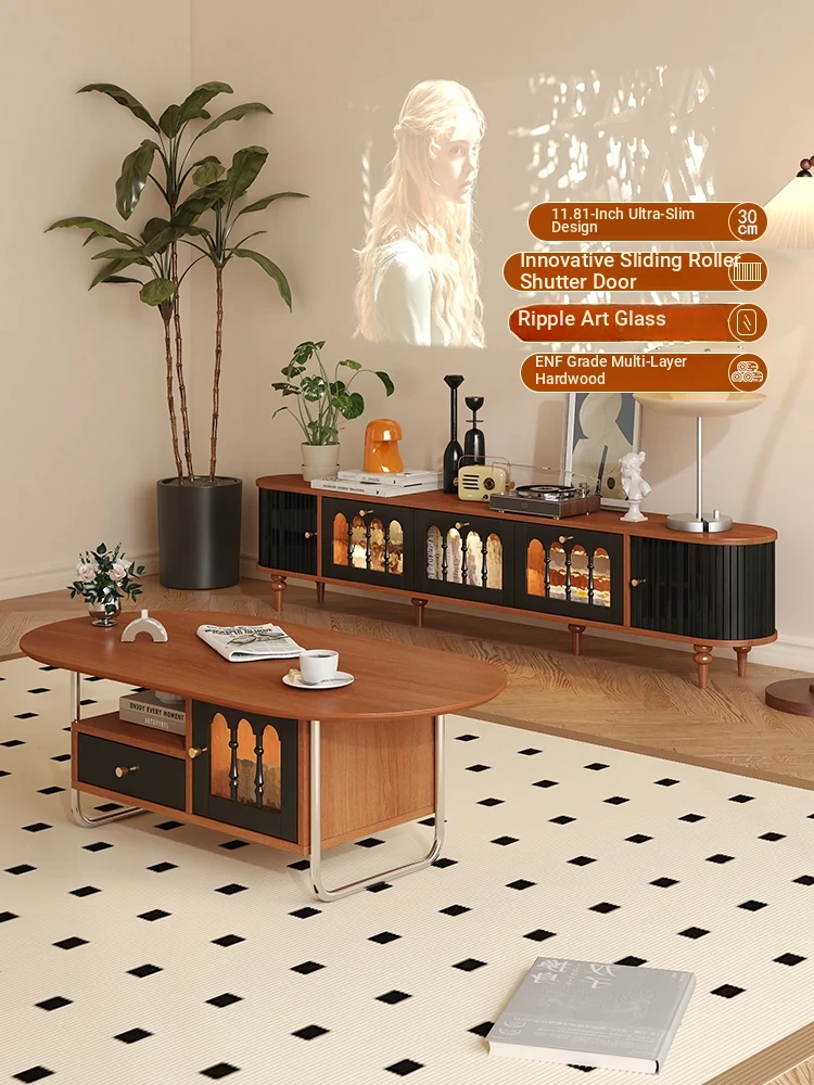 Vintage French-Style Solid Wood Rounded TV Stand & Coffee Table Set - Space-Saving Retro Storage Cabinet for Small Living Rooms