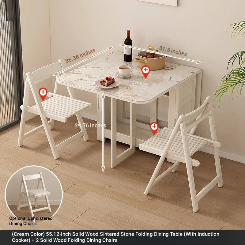 55.12 in solid wood rock board Foldable dining table [cream] + Induction cooker + solid wood Foldable dining chair * 2