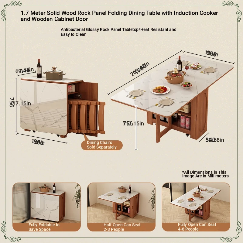 66.93 in solid wood rock plate Foldable dining table [glass door + cream] + Induction cooker
