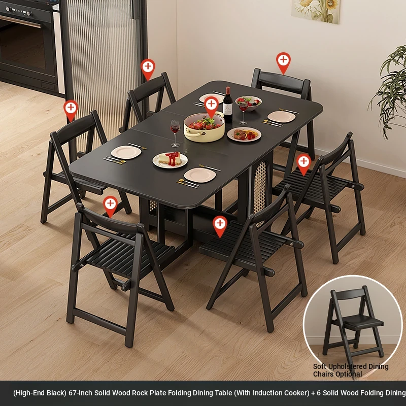 66.93 in solid wood rock plate Foldable dining table [Classy Black] + Induction cooker + solid wood Foldable dining chair * 6