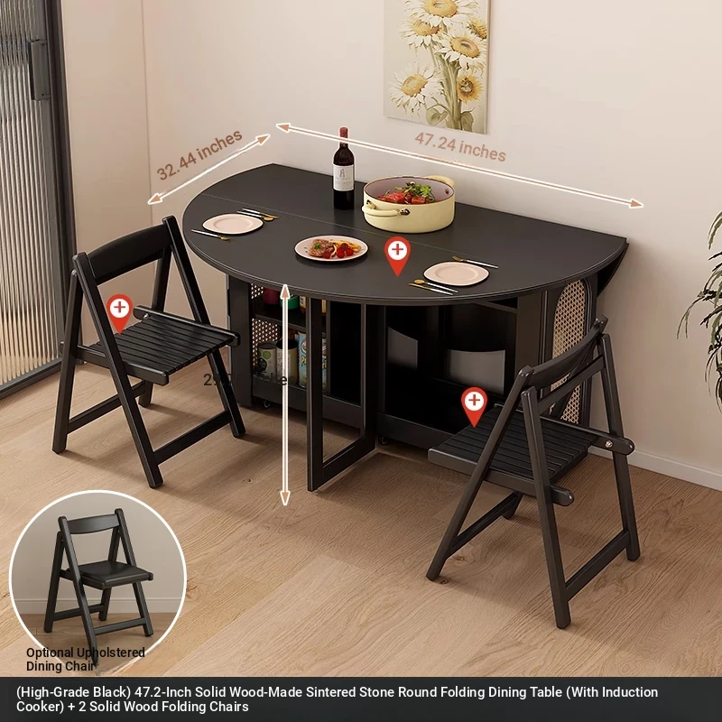 47.24 in solid wood rock plate round Foldable dining table [five anti-bacterial Classy Black] + Induction cooker + Foldable dining chair * 2