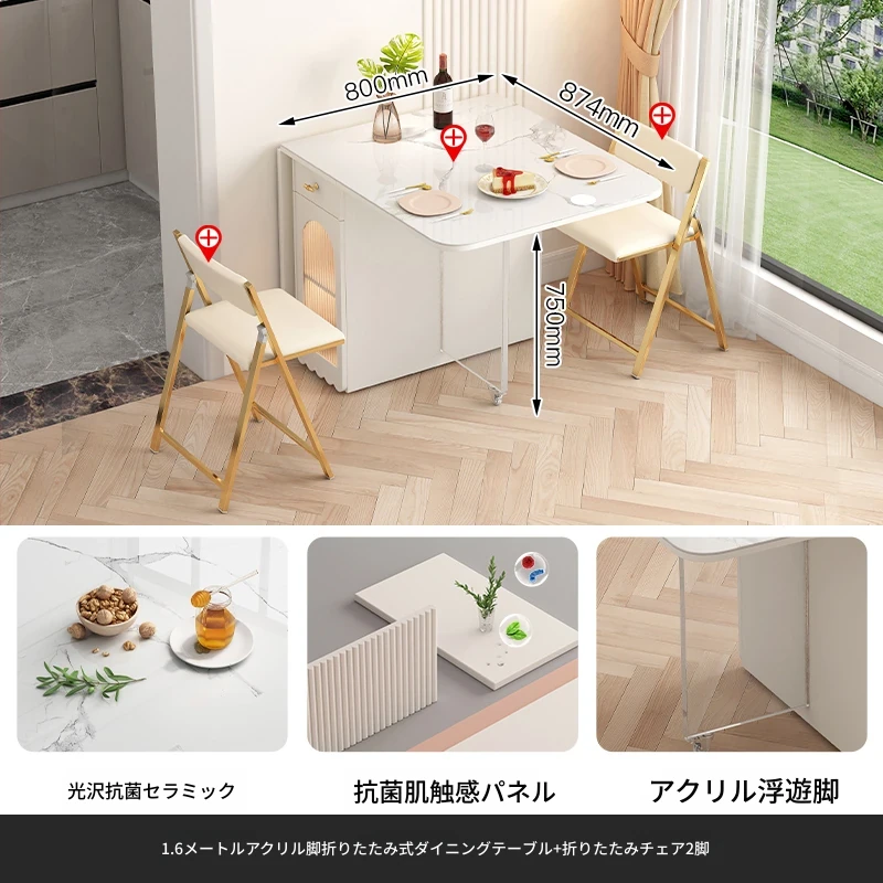 1.6メートル折りたたみダイニングテーブル アクリル脚+暖白色の折りたたみ椅子*2