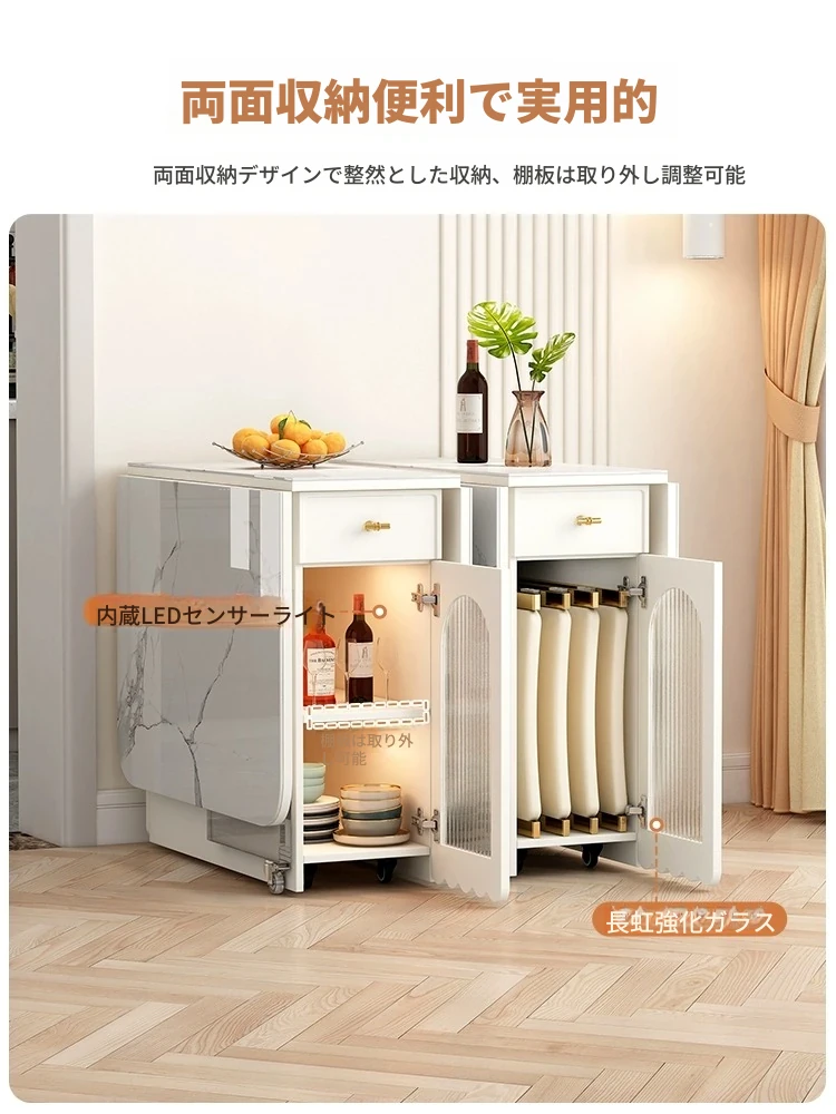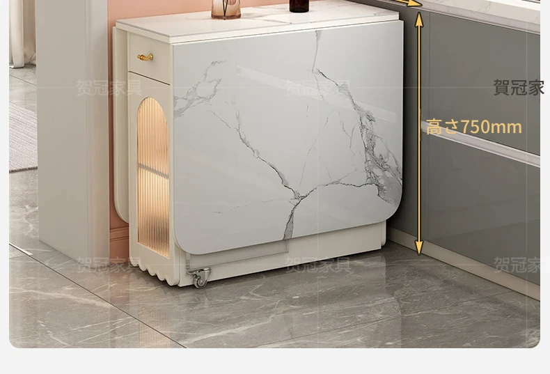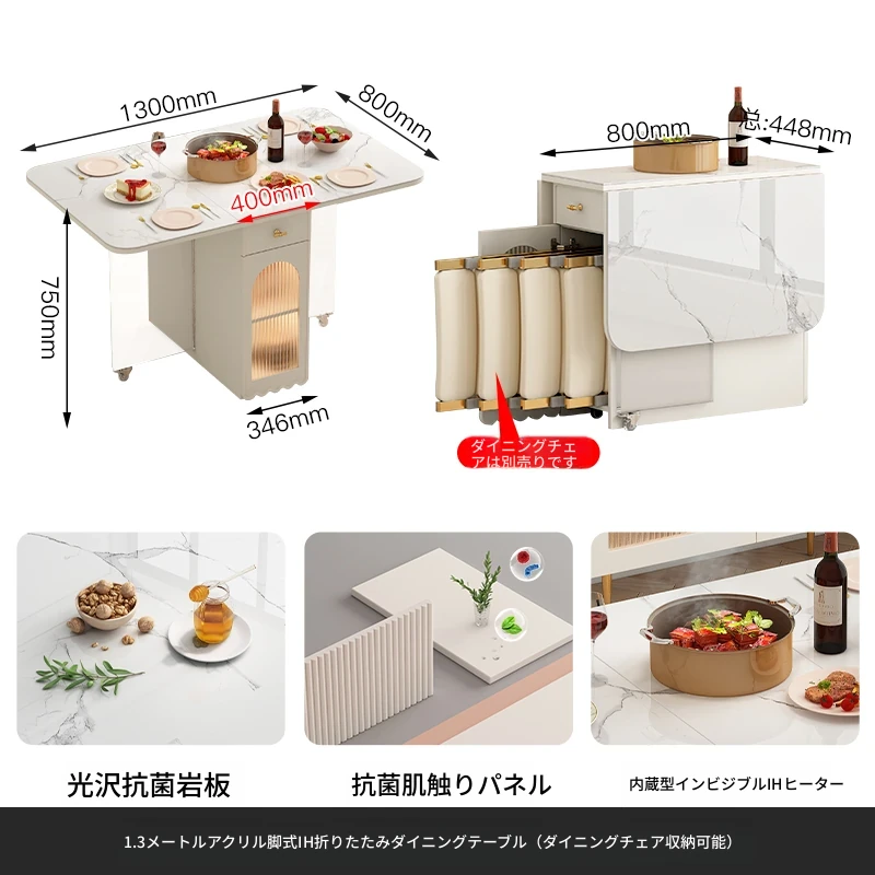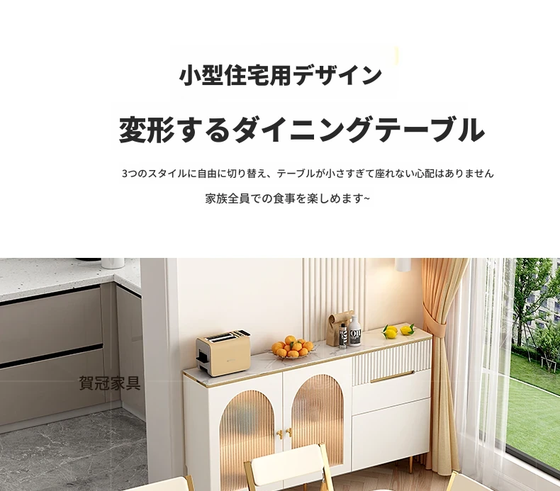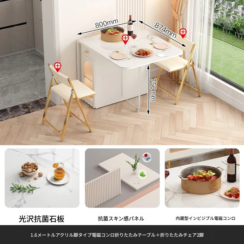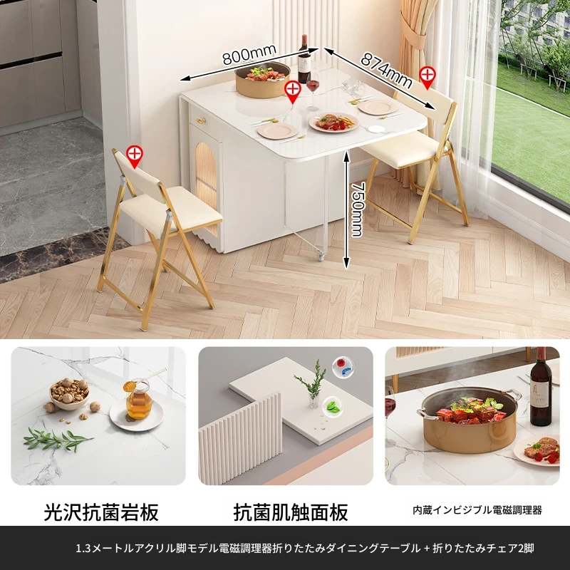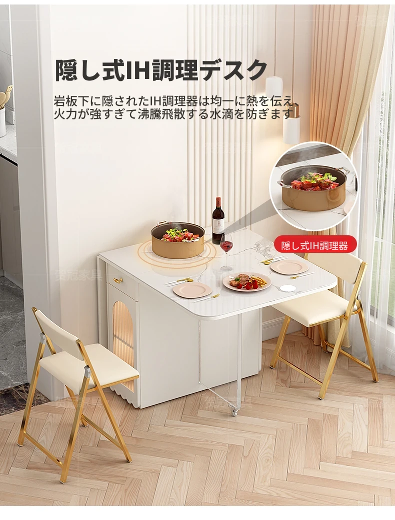 高級感溢れる!岩板可動式ダイニングテーブル兼収納キャビネット、電磁コンロ付きで省スペースの小型住宅にも最適な折りたたみ式デザイン。