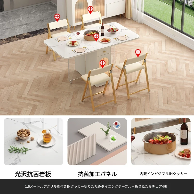 1.6メートルIHコンロ折りたたみダイニングテーブル アクリル仕様+暖白色の折りたたみ椅子*4