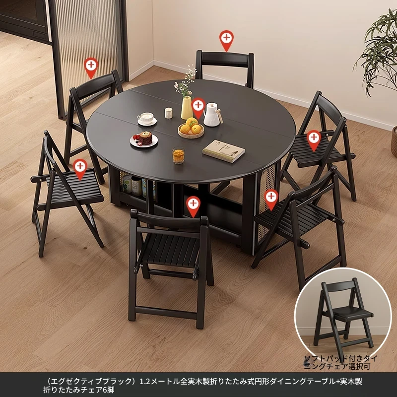 1.2メートル全実木ラウンド折りたたみテーブル【五防抗菌 高級ブラック】+折りたたみ椅子*6