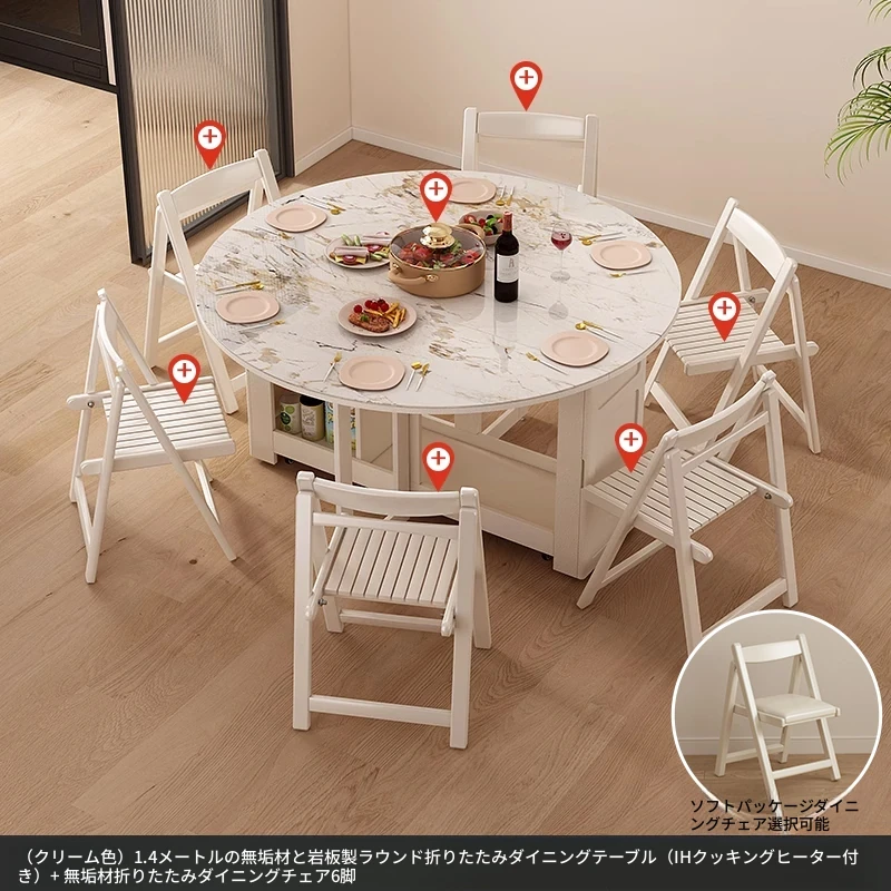1.4メートル実木岩板ラウンド折りたたみテーブル【スキン感ブリザード クリーム色】+IHクッカー+折りたたみ椅子*6