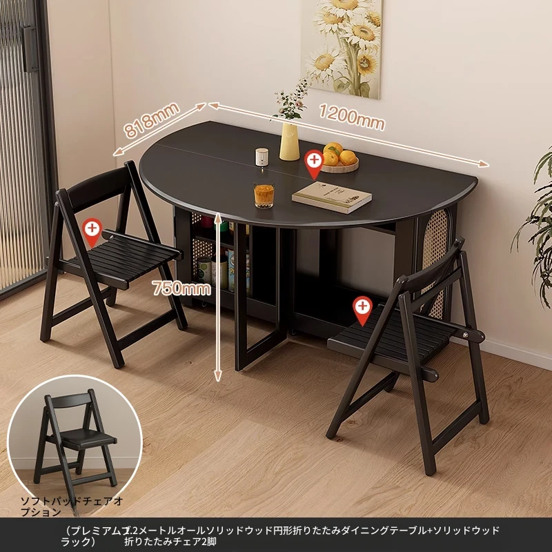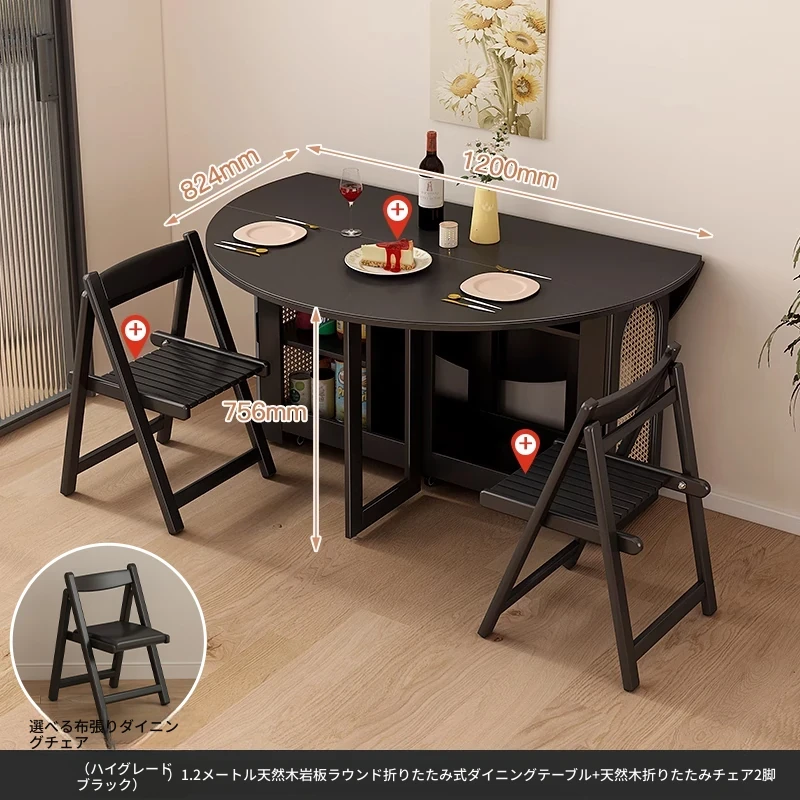 1.2メートル全実木ラウンド折りたたみテーブル【五防抗菌 高級ブラック】+折りたたみ椅子*2