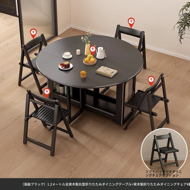 1.2メートル全実木ラウンド折りたたみテーブル【五防抗菌 高級ブラック】+実木折りたたみ椅子*4