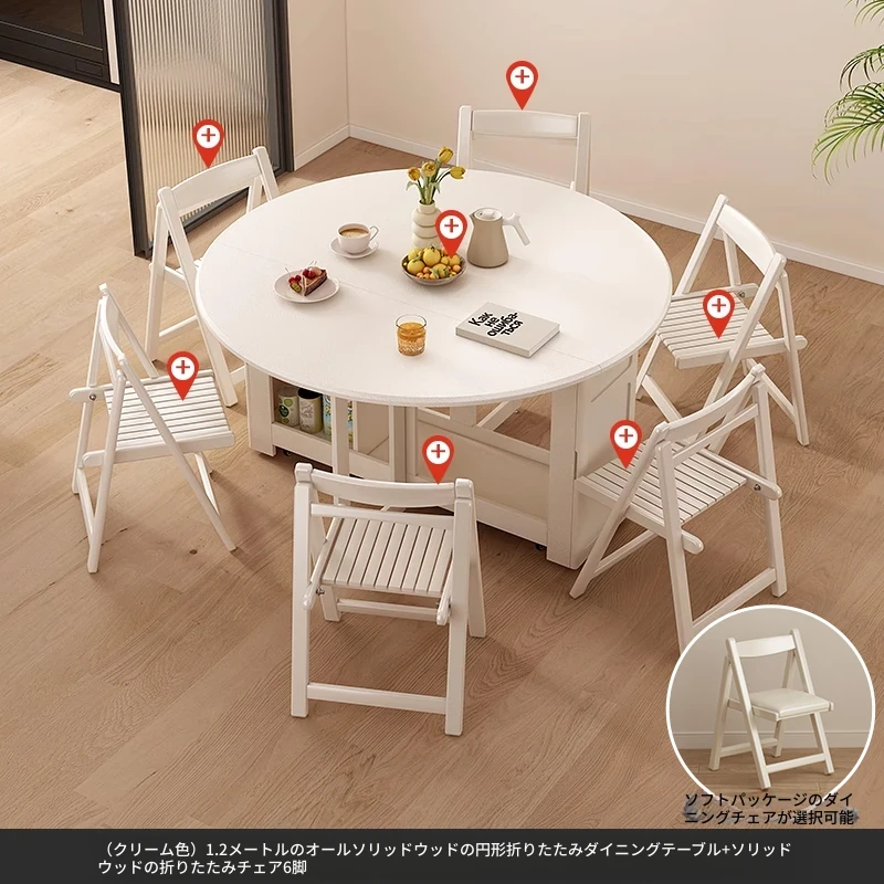 1.2メートル全実木ラウンド折りたたみテーブル【スキン感ブリザード クリーム色】+折りたたみ椅子*6
