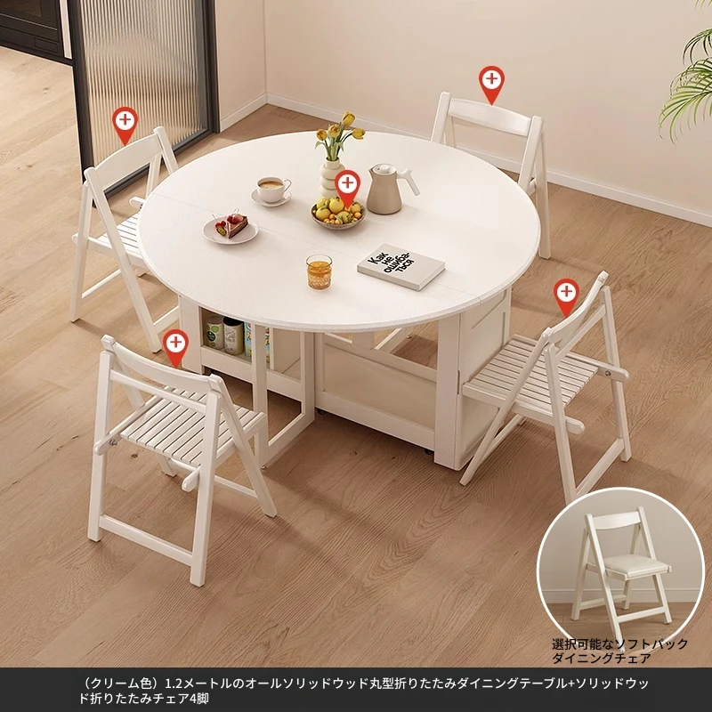 1.2メートル全実木ラウンド折りたたみテーブル【スキン感ブリザード クリーム色】+折りたたみ椅子*4
