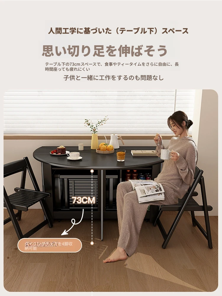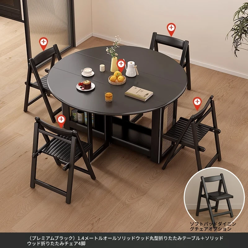 1.4メートル全実木ラウンド折りたたみテーブル【五防抗菌 高級ブラック】+折りたたみ椅子*4