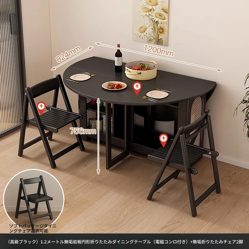 1.2メートル実木岩板ラウンド折りたたみテーブル【五防抗菌 高級ブラック】+IHクッカー+折りたたみ椅子*2