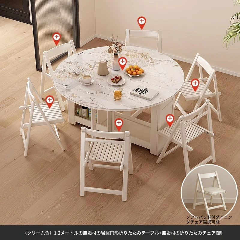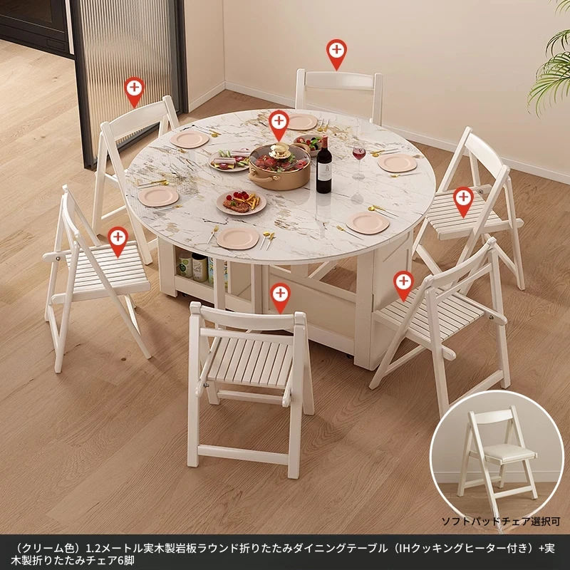 1.2メートル実木岩板ラウンド折りたたみテーブル【スキン感ブリザード クリーム色】+IHクッカー+折りたたみ椅子*6
