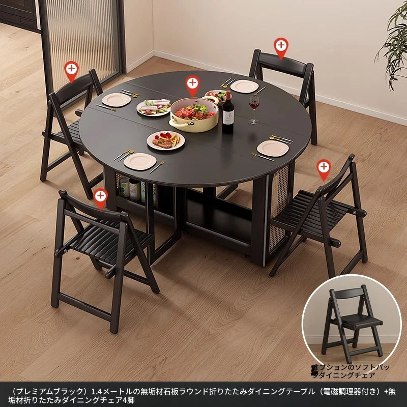 1.4メートル実木岩板ラウンド折りたたみテーブル【五防抗菌 高級ブラック】+IHクッカー+折りたたみ椅子*4