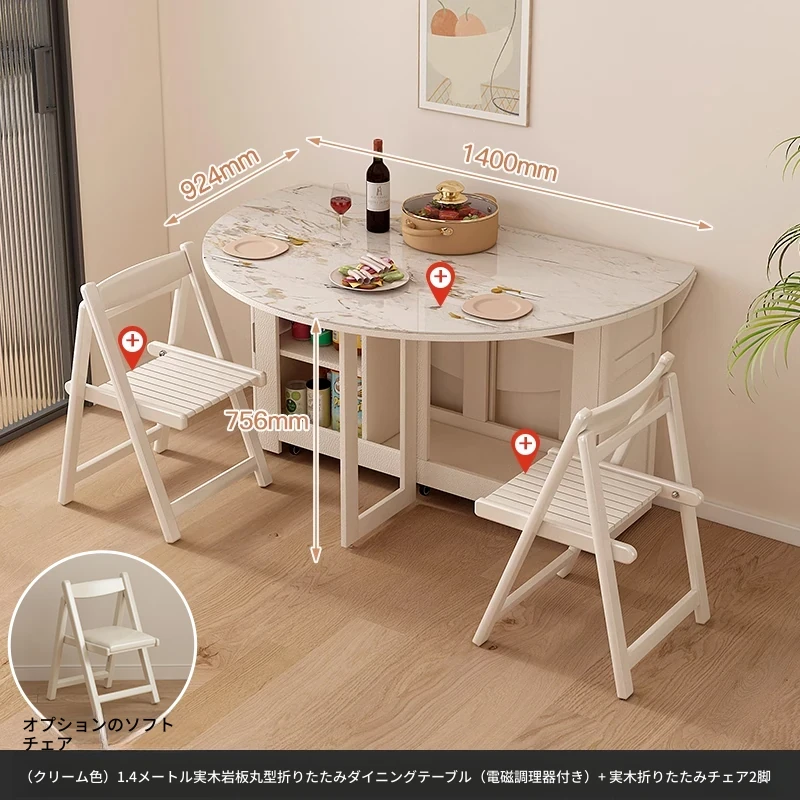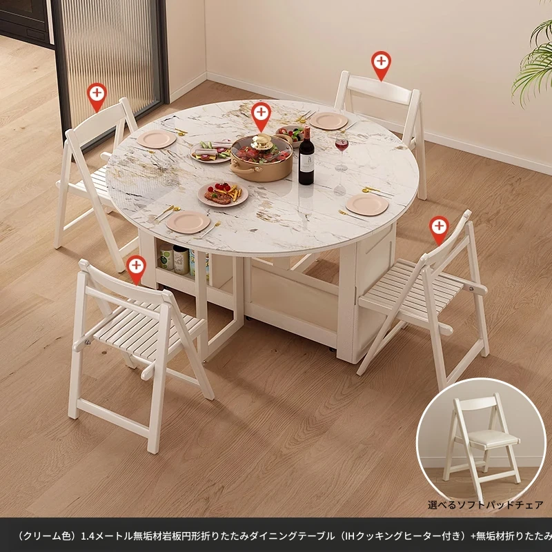 1.4メートル実木岩板ラウンド折りたたみテーブル【スキン感ブリザード クリーム色】+IHクッカー+折りたたみ椅子*2