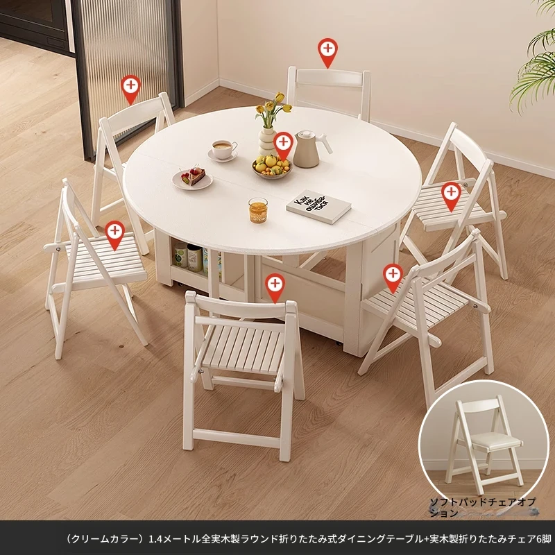 1.4メートル全実木ラウンド折りたたみテーブル【スキン感ブリザード クリーム色】+折りたたみ椅子*6