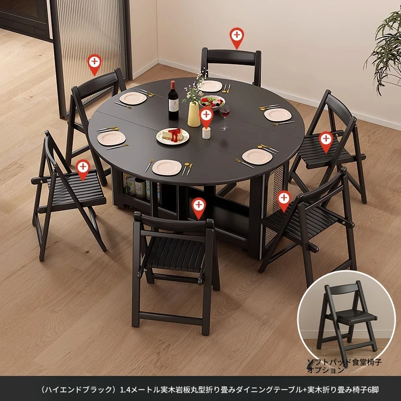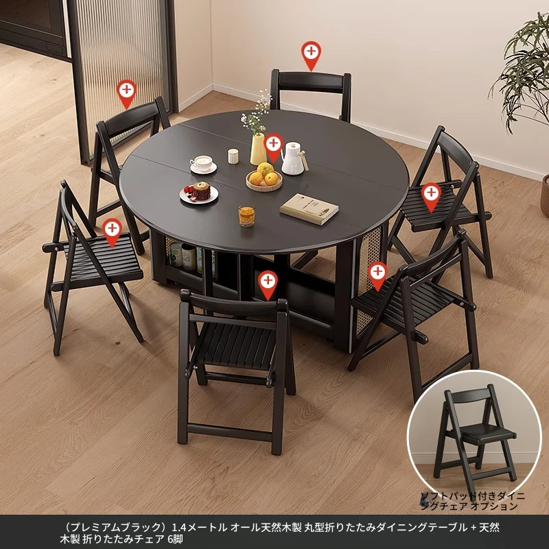 1.4メートル全実木ラウンド折りたたみテーブル【五防抗菌 高級ブラック】+折りたたみ椅子*6