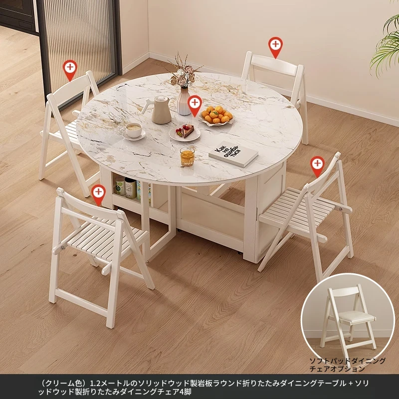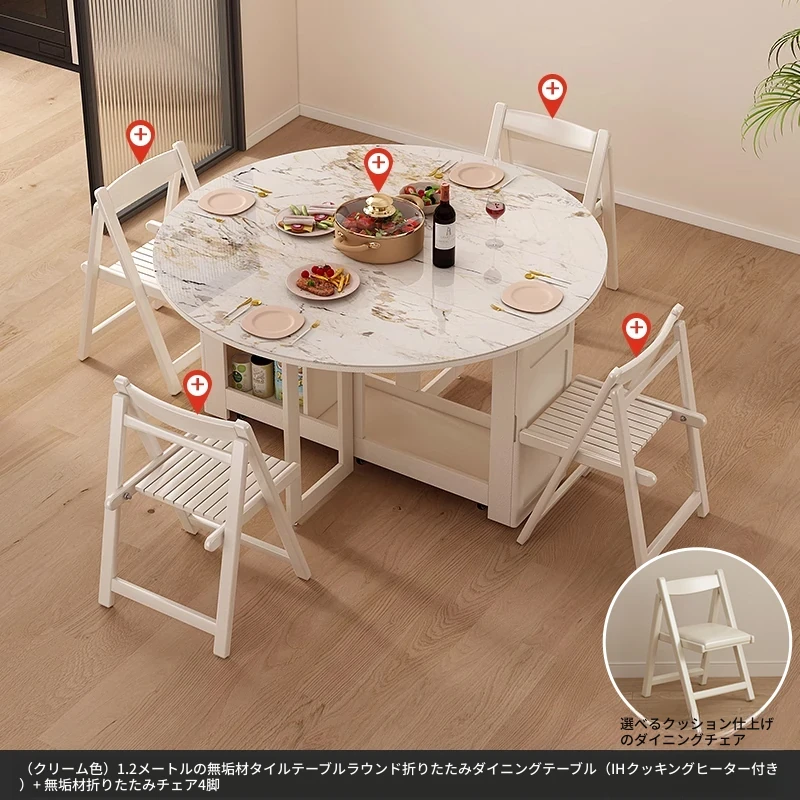 1.2メートル実木岩板ラウンド折りたたみテーブル【スキン感ブリザード クリーム色】+IHクッカー+折りたたみ椅子*4
