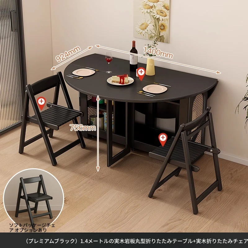 1.4メートル全実木ラウンド折りたたみテーブル【五防抗菌 高級ブラック】+折りたたみ椅子*2
