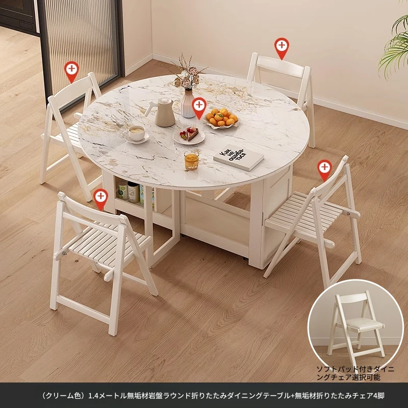 1.4メートル実木岩板ラウンド折りたたみテーブル【スキン感ブリザード クリーム色】+IHクッカー+折りたたみ椅子*4