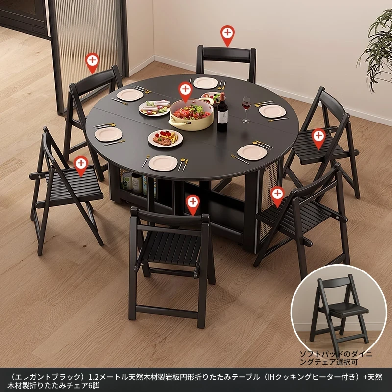 1.2メートル実木岩板ラウンド折りたたみテーブル【五防抗菌 高級ブラック】+IHクッカー+折りたたみ椅子*6