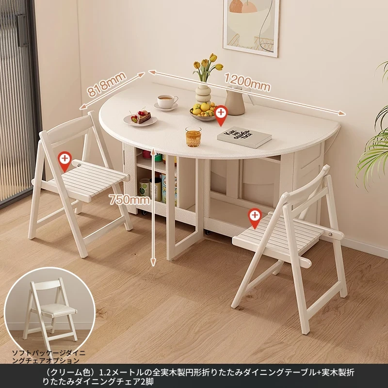 1.2メートル全実木ラウンド折りたたみテーブル【スキン感ブリザード クリーム色】+折りたたみ椅子*2