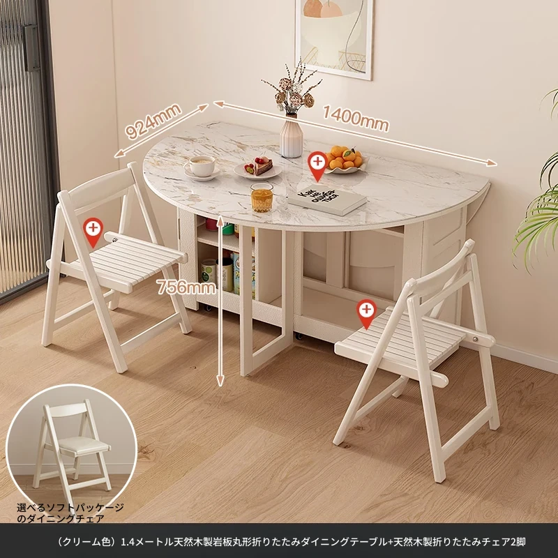 1.4メートル実木岩板ラウンド折りたたみテーブル【スキン感ブリザード クリーム色】+折りたたみ椅子*2