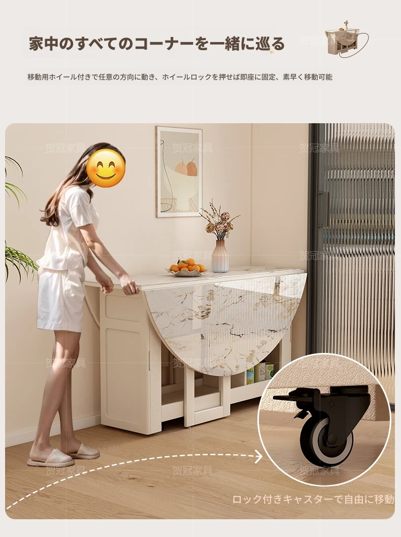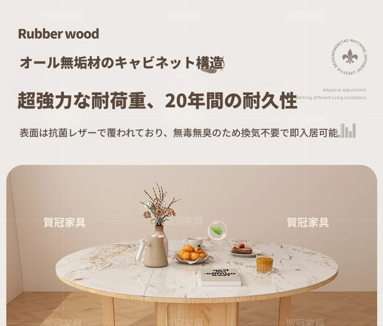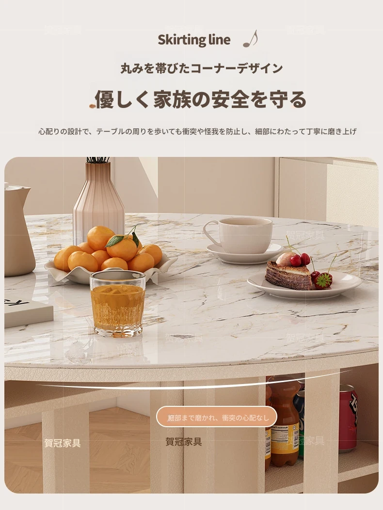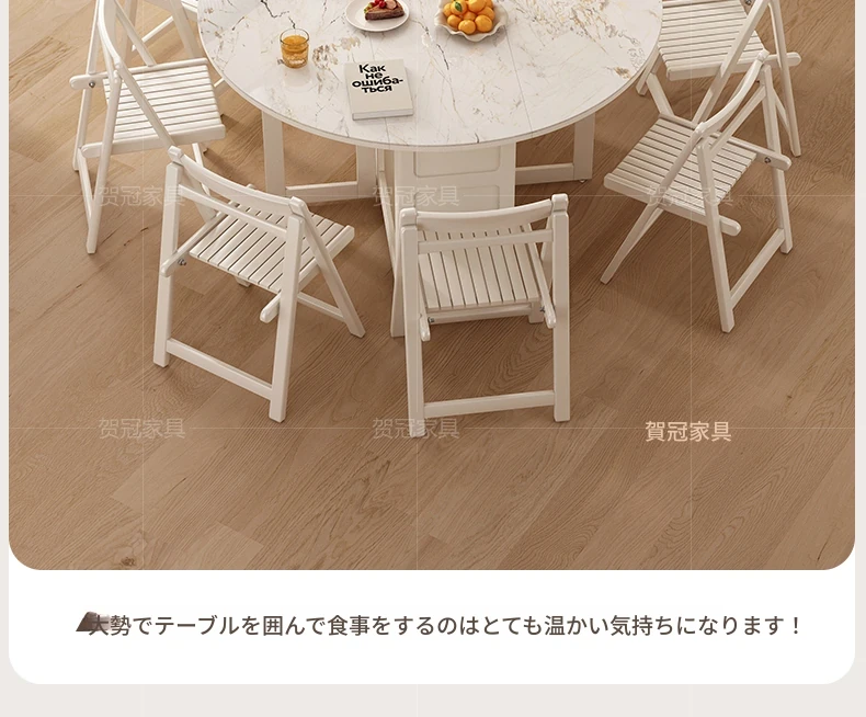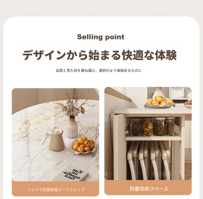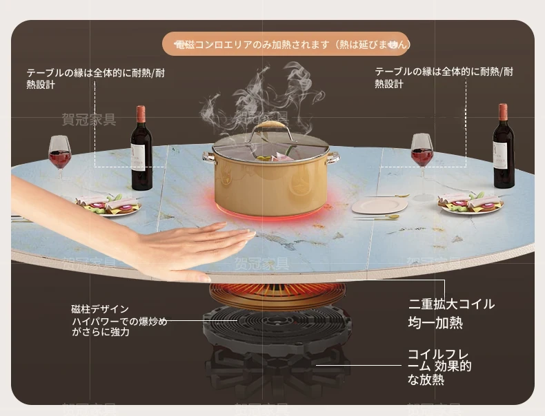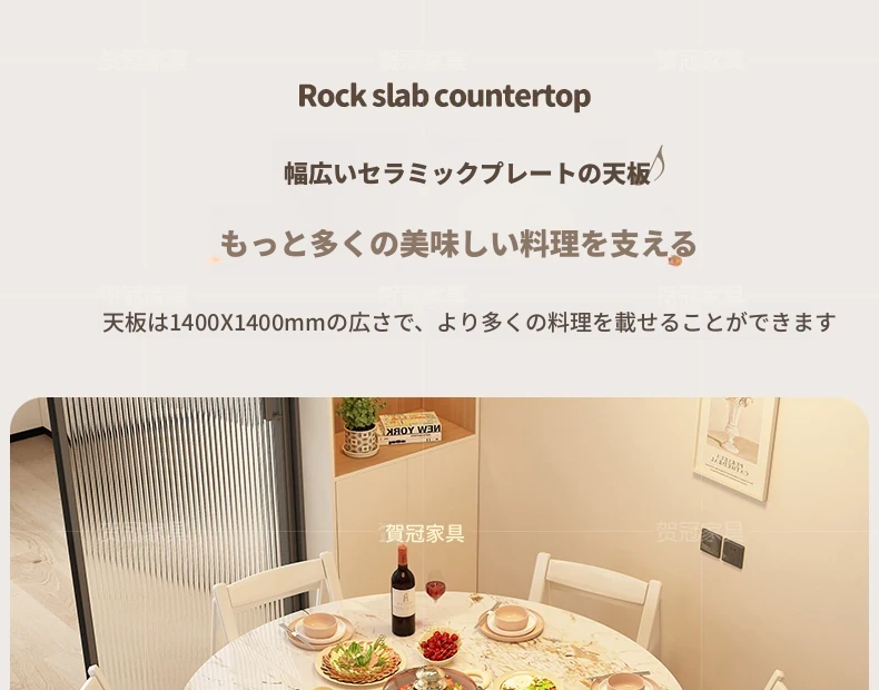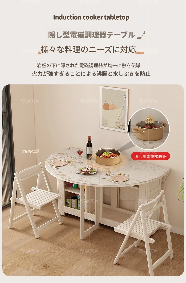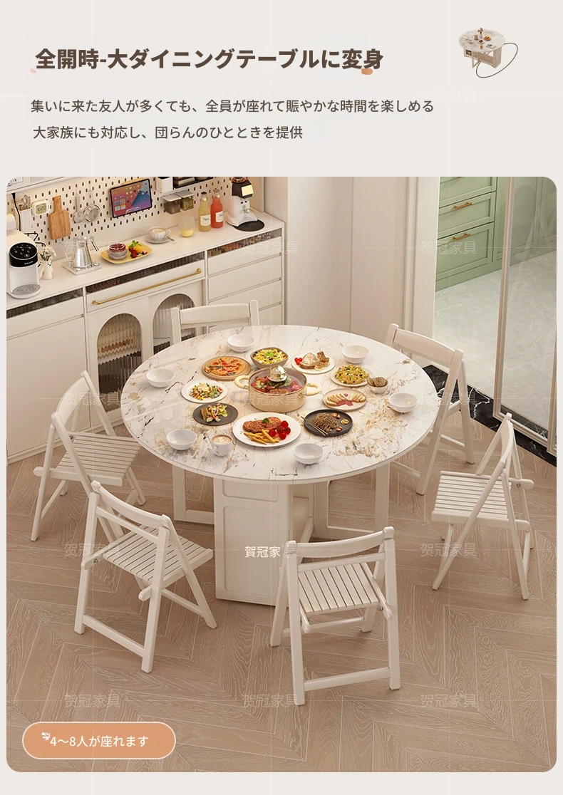 【魅力十足】クリーム風岩板伸縮ダイニングセット・電磁調理器付き、多機能丸型/長方形テーブル・10人用実木製食卓