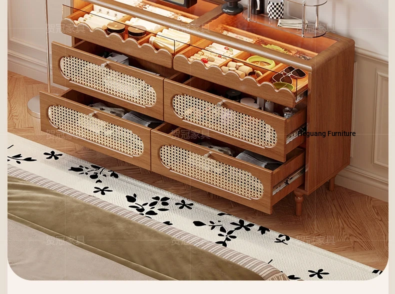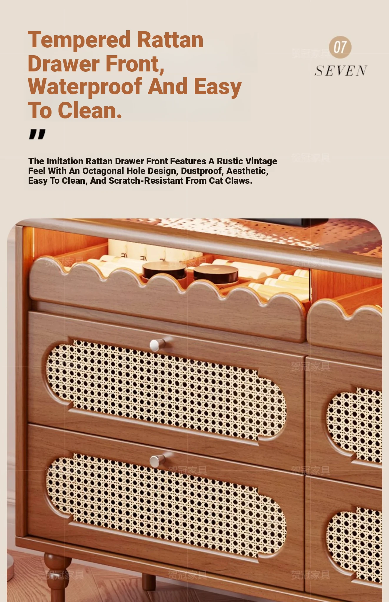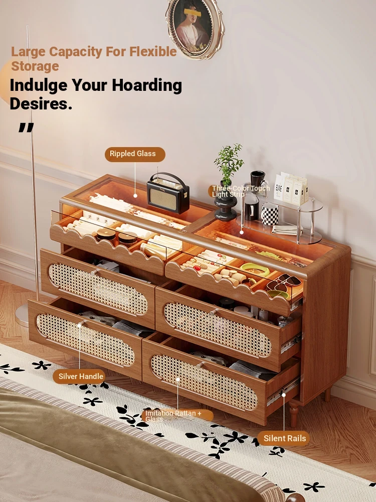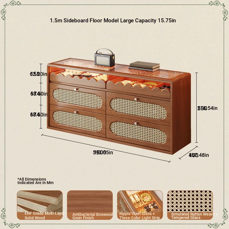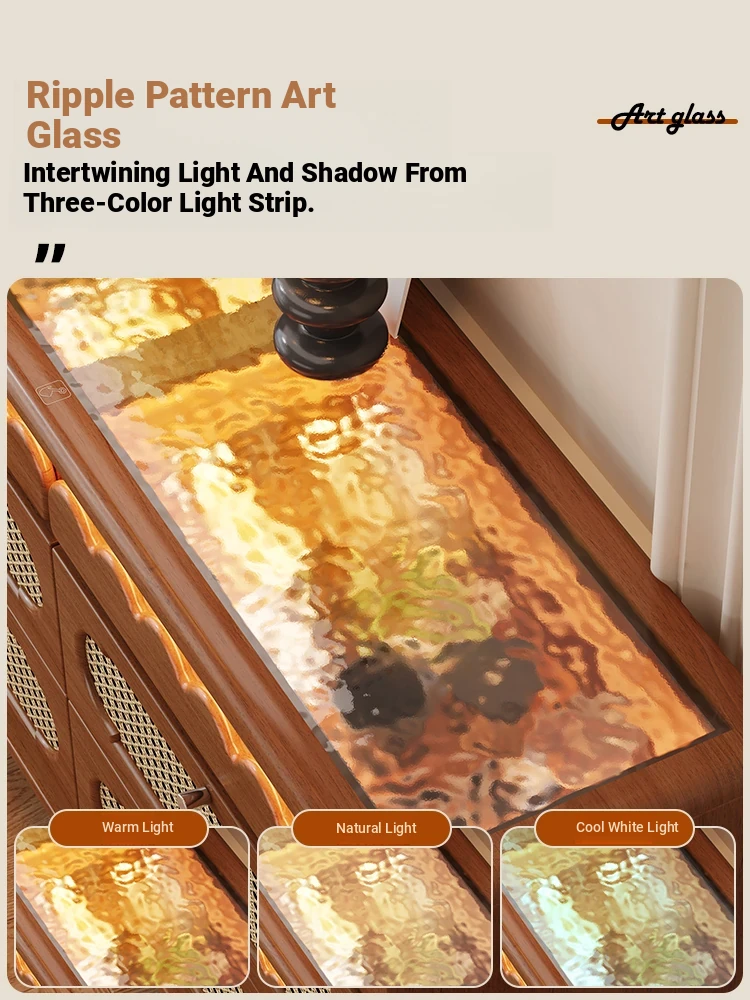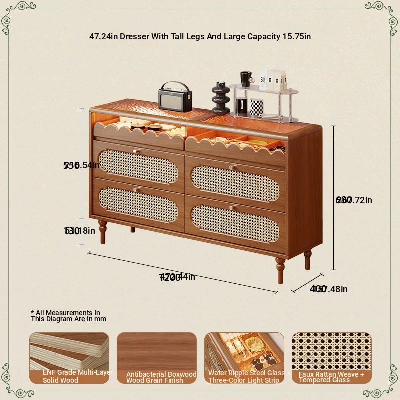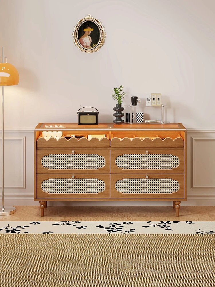 Vintage Chinese Solid Wood Sideboard with Built-in Storage - South Asian-Style Six-Drawer Cabinet for Living Room with Ambient Lighting