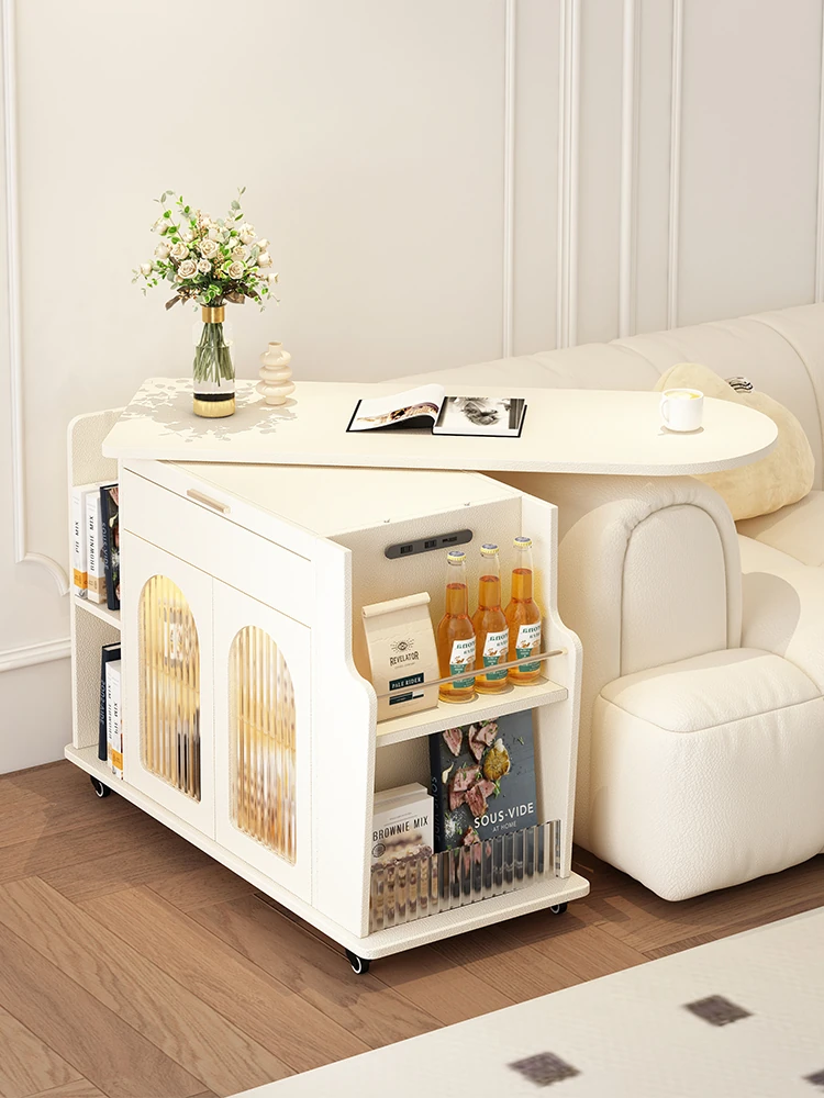 27.56 in Foldable Movable tea table cabinet [leather White + walnut grain]]