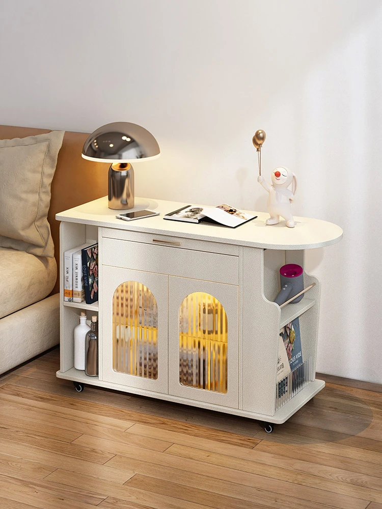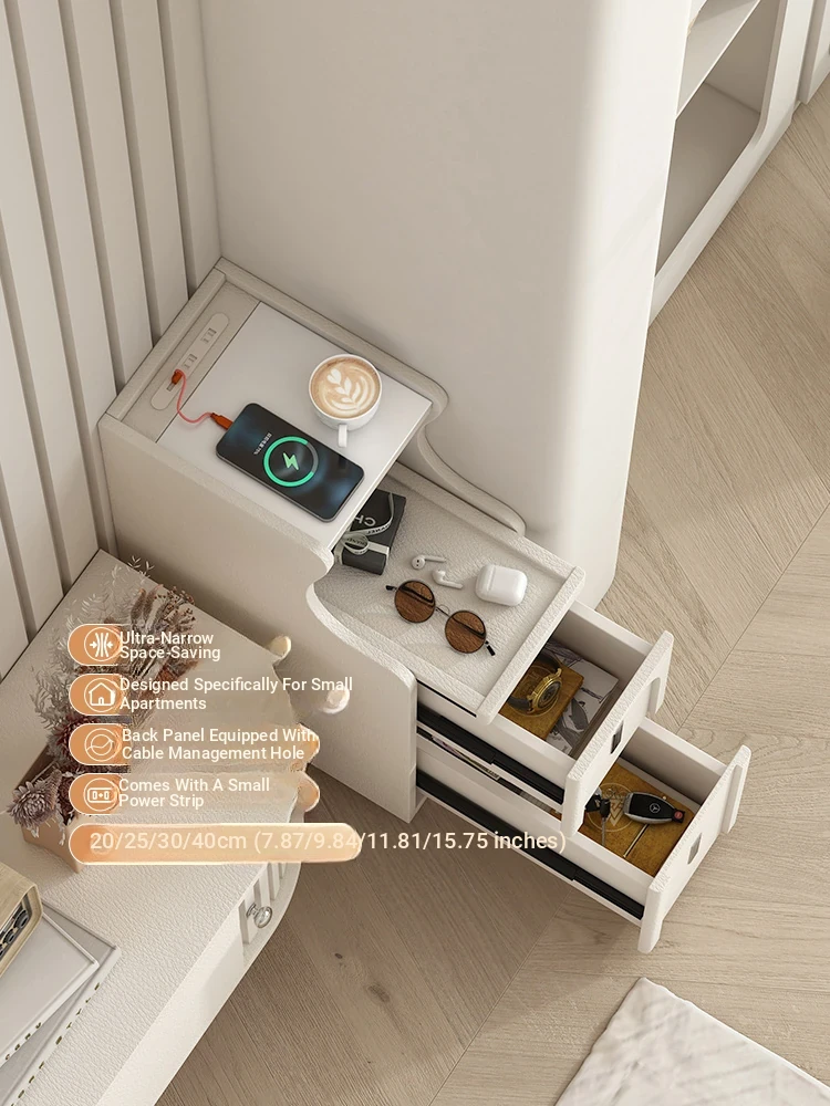 23.62in Multifunctional Adjustable Side Table [Cream White Skin Sense Leather Pattern + Lifting Rotate Desktop + Universal Wheel + USB Charging + Lamp Band + Fingerprint Lock]]